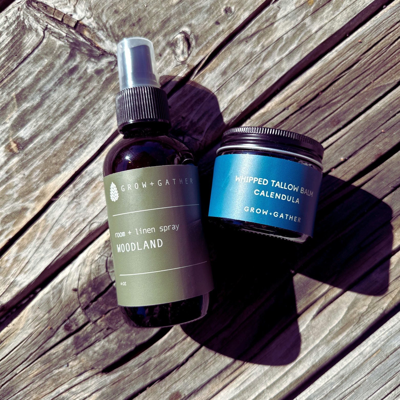 Settle into that quiet-cabin feeling. The Winter Cabin Set brings the feeling of a cozy forest hideaway indoors. This pairing combines our Woodland Room & Linen Spray with our soothing Calendula Whipped Tallow Balm, keeping dry winter skin soft, calm, and nourished. A grounding, cold-season duo inspired by crisp trail mornings and warm fireside nights.
